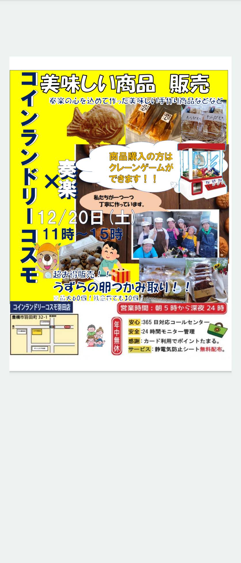 11時より出張販売いたします!購入者の方にはクレーンゲームもできちゃう!美味しい商品盛りだくさん!