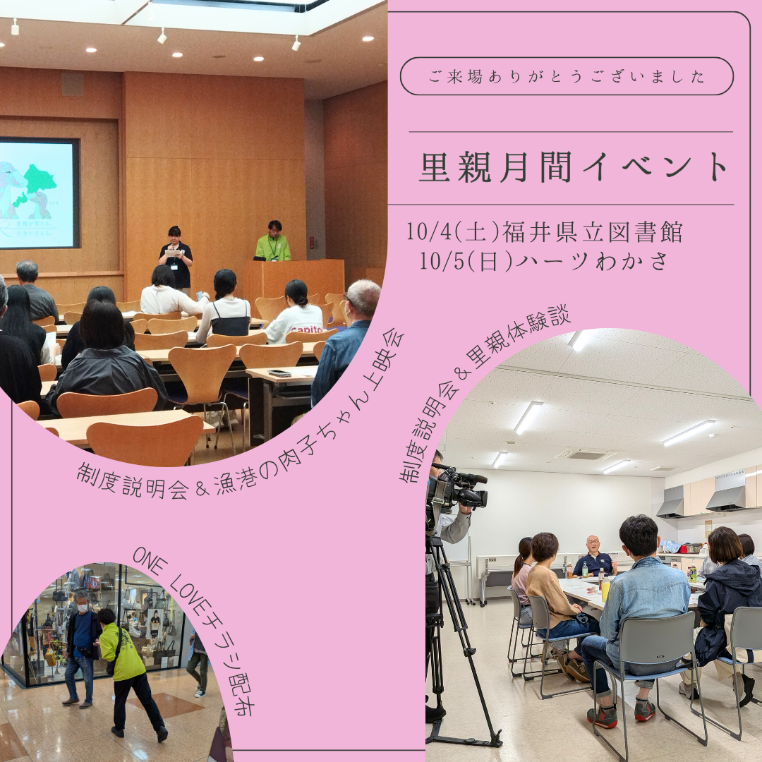 10月4日(土)と5日(日)に里親月間イベントとして、里親制度についての説明会、漁港の肉子ちゃんの上映会、福井県の里親さんの体験談を開催しました。また、里親会の方と一緒にONE LOVEのチラシ配布も行いました。