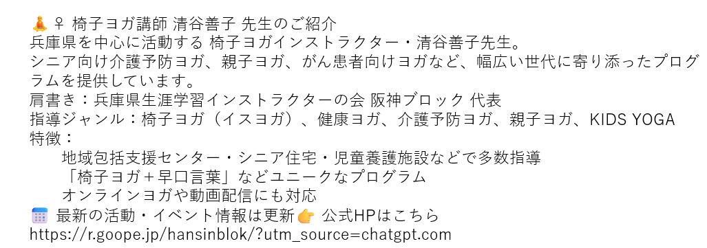 阪神ブロックの活動は、ヨガや、エアロビクス・アロマヨガ・CHIR FITNESSを中心に出張し、健康・美容・癒し・などで活動中です。