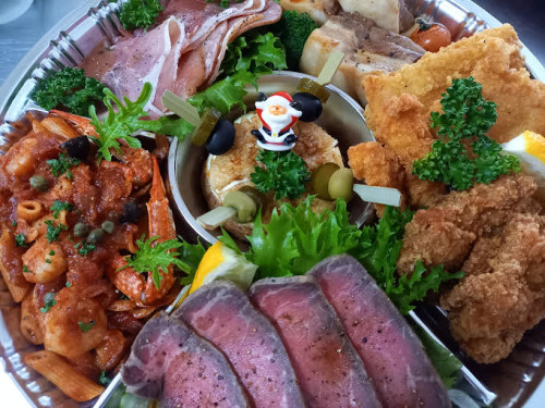 ※自家製ローストビーフのサラダ仕立て・生ハム&サラミ・柔らか塩豚グリル・ガーリックチキングリル(クリスマスはフライドチキン)・魚介トマトソースのショートパスタ・ソーセージのミックスピザetc.、約4人前の盛り合わせです