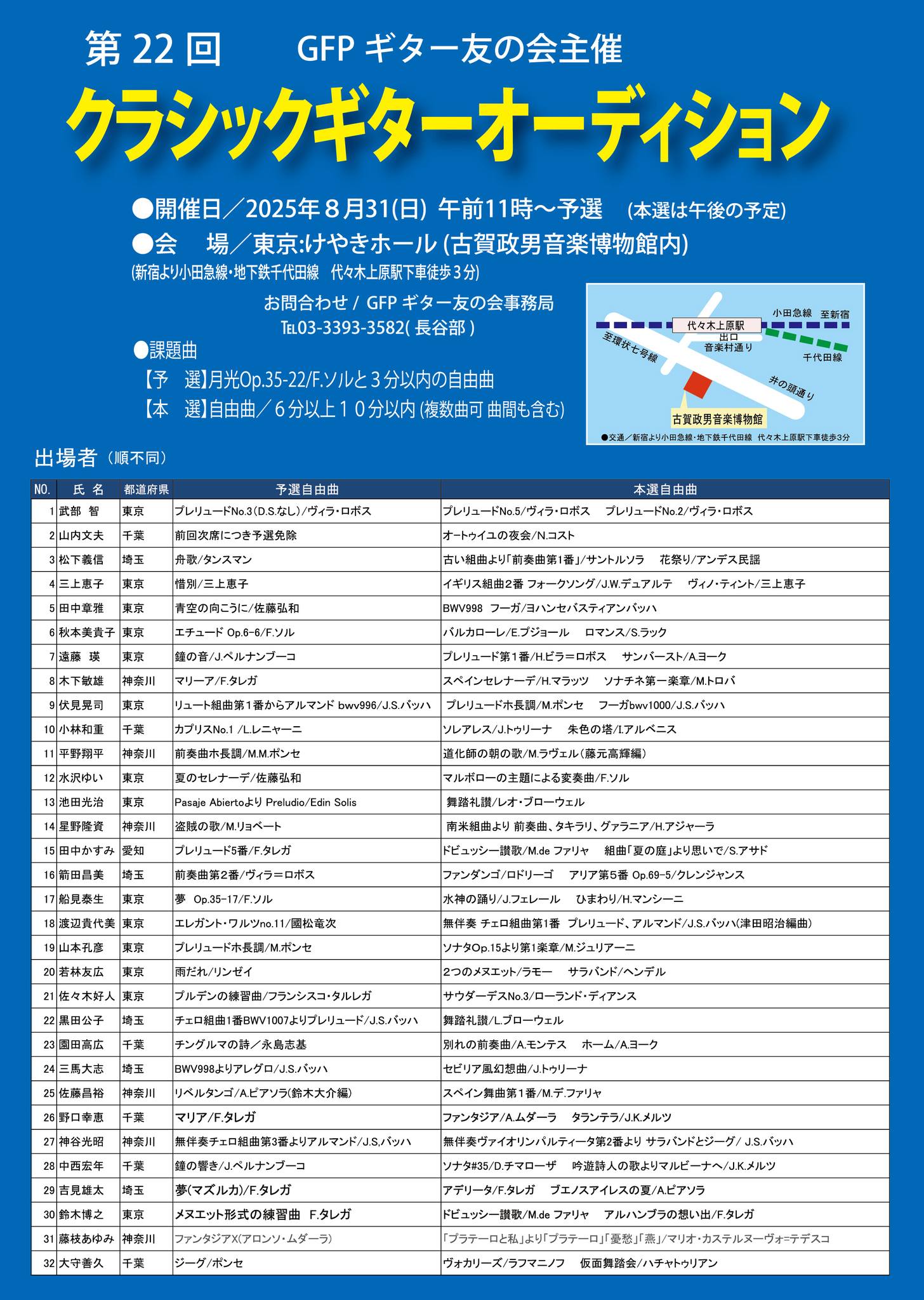 8 月31 日(日)、東京渋谷区の古賀政男音楽博物館内のけやきホールに於いてGFPギター友の会主催 第22 回クラシックギターオーディションが行われました。