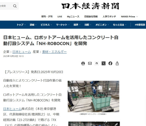 弊社製作の装置がプレスリリースされました。記事全文は下記より日本ヒューム、ロボットアームを活用したコンクリート自動打設システム「NH-ROBOCON」を開発 - 日本経済...