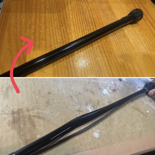 タモの柄の折れ修理。先端で折れてしまっていますが、振り出し式の為、2番目か3番目に新たにタモの取り付け部を付ける事で修理出来ます。少し短くなりますが、パワーUP...