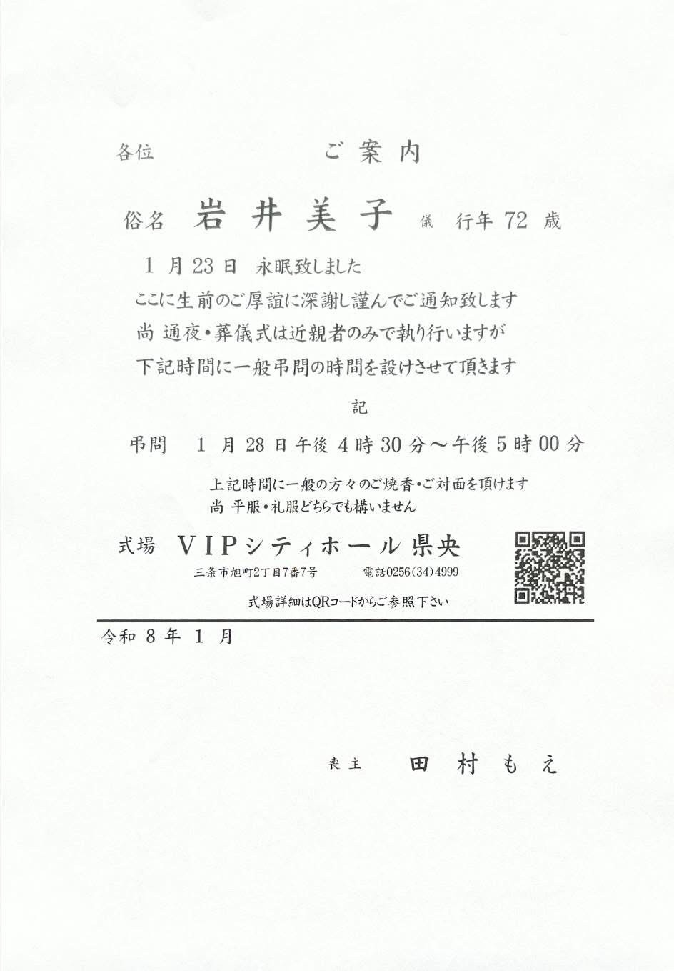 岩井美子さんの訃報を、お知らせします。