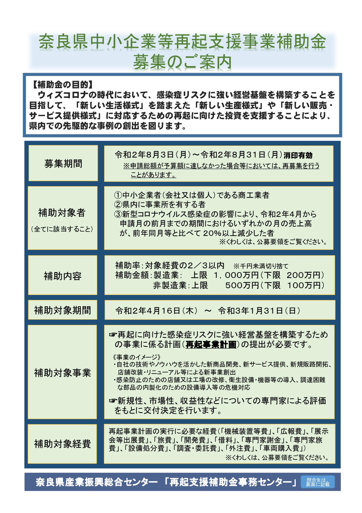 奈良県産業振興センター「再起支援補助金事務センター」HP