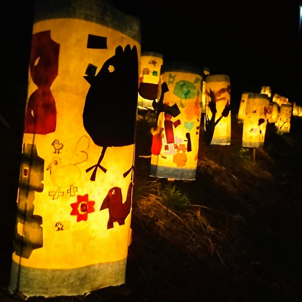 海老根伝統手漉和紙工房の周辺において、地域住民や学生らが、絵や文字を描いた灯ろうに火を灯し、静かな田園に幻想的な風景を映し出します