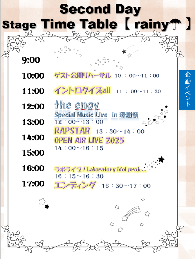 10月11日(土)、10月12日(日)の2日間にわたり行われる今年度の環謝祭。例年以上に充実した企画・ステージパフォーマンス・模擬店・フリーマーケットをお楽しみください。