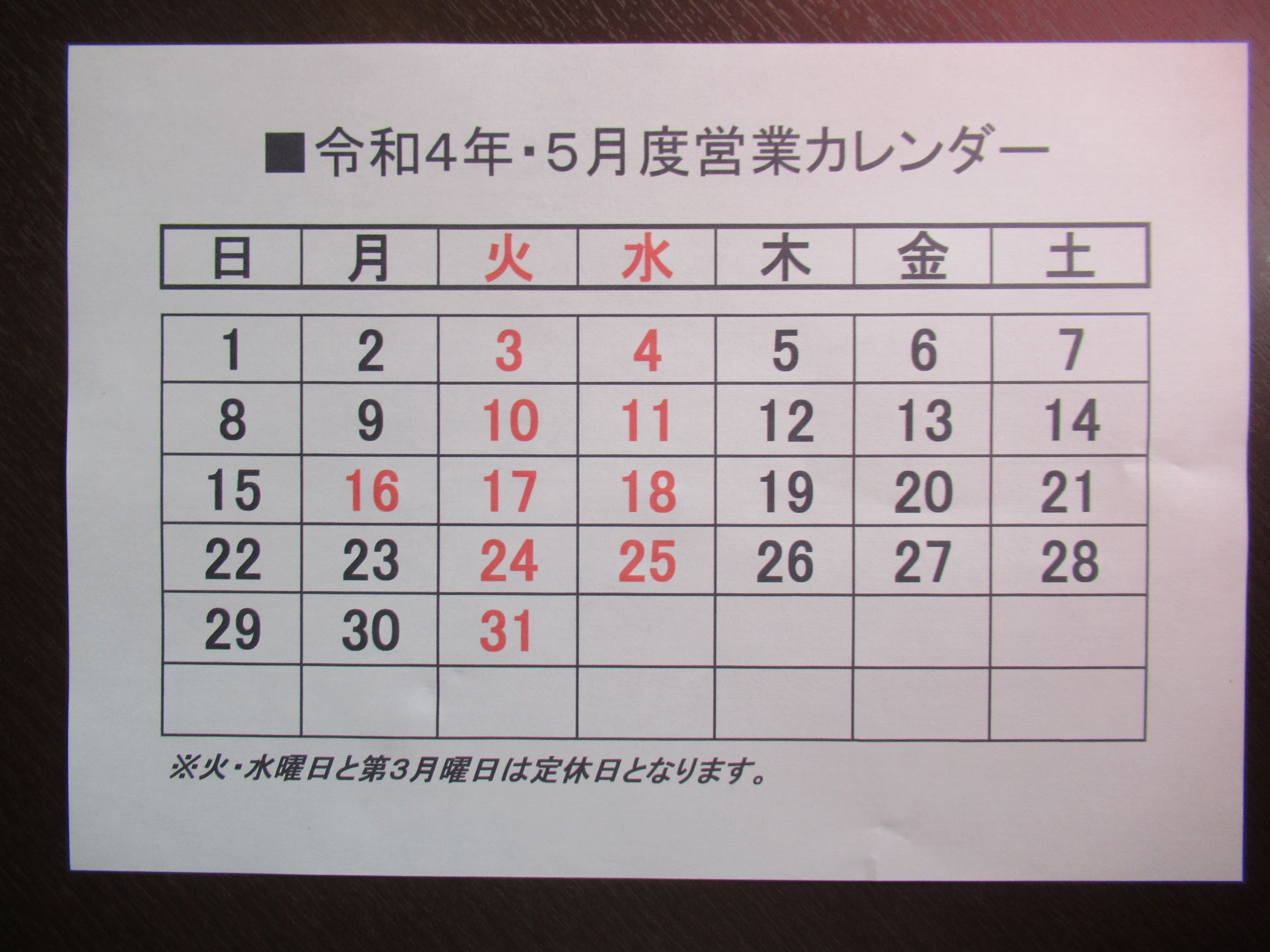 5月の連休は、通常営業をしてます。5月3日(火)・5月4日(水)は、定休日のため休みとなります。