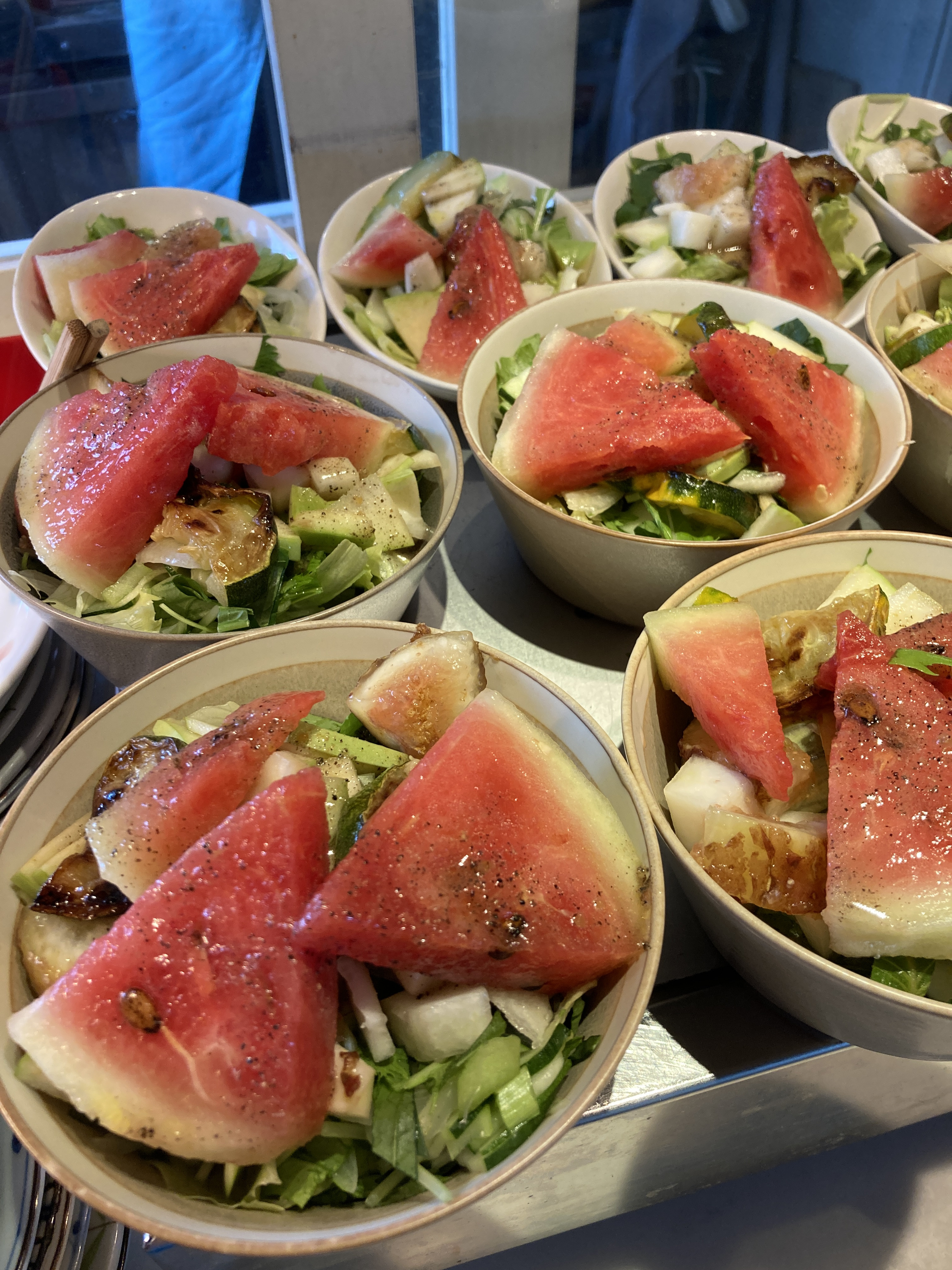 今週は全部入り・・・スイカとメロンと無花果と焼きズッキーニのサラダ。