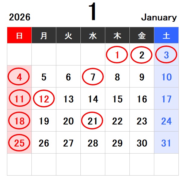 2026年1月の営業日のお知らせです。