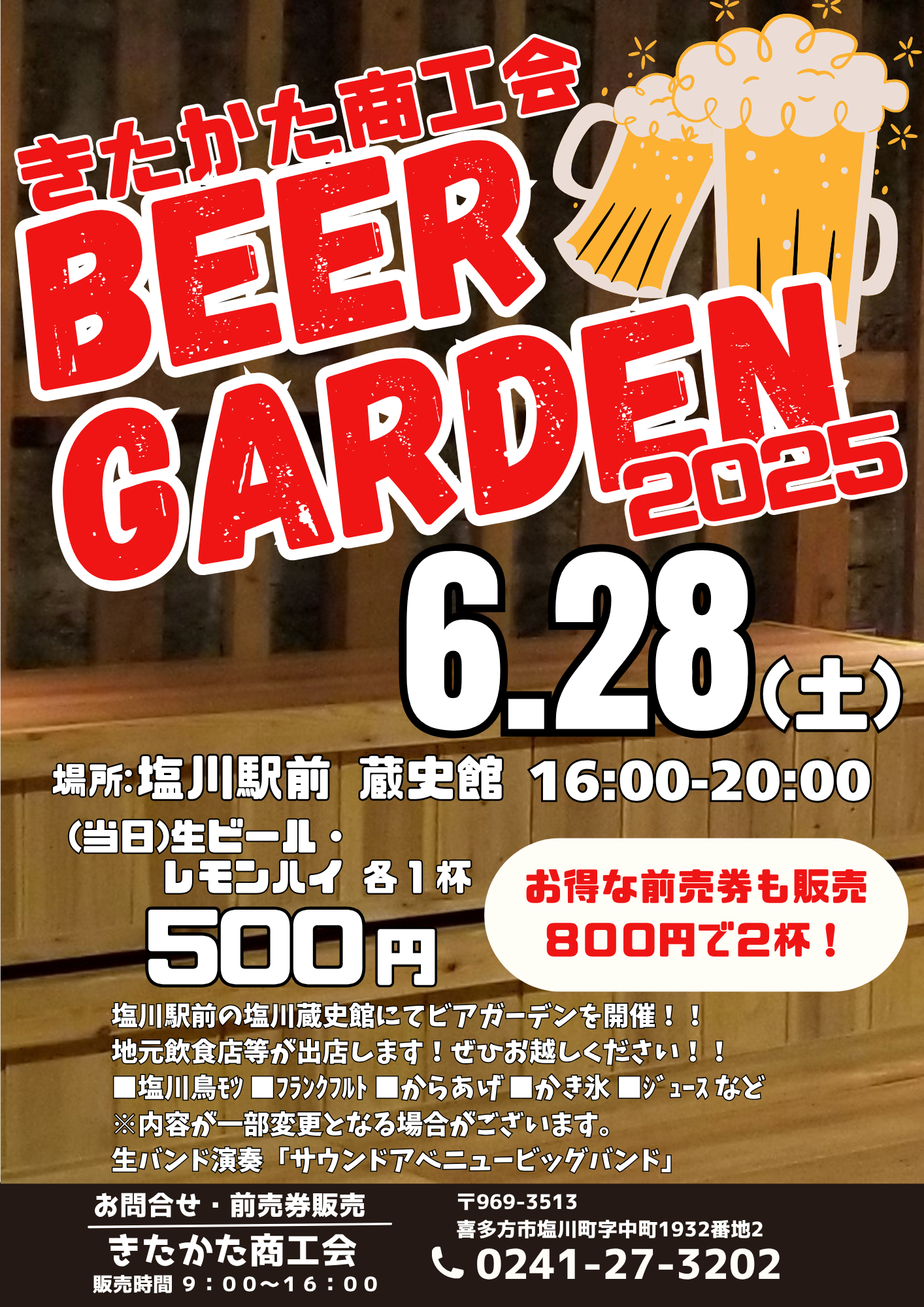 令和7年6月28日㈯にきたかた商工会ビアガーデン2025を塩川駅前「蔵史館」にて開催します!