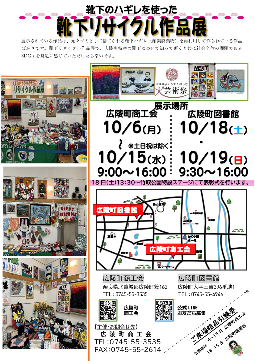 かぐや姫まつり当日、広陵町図書館では「靴下ハギレを使ったリサイクル作品展」を同時開催します!