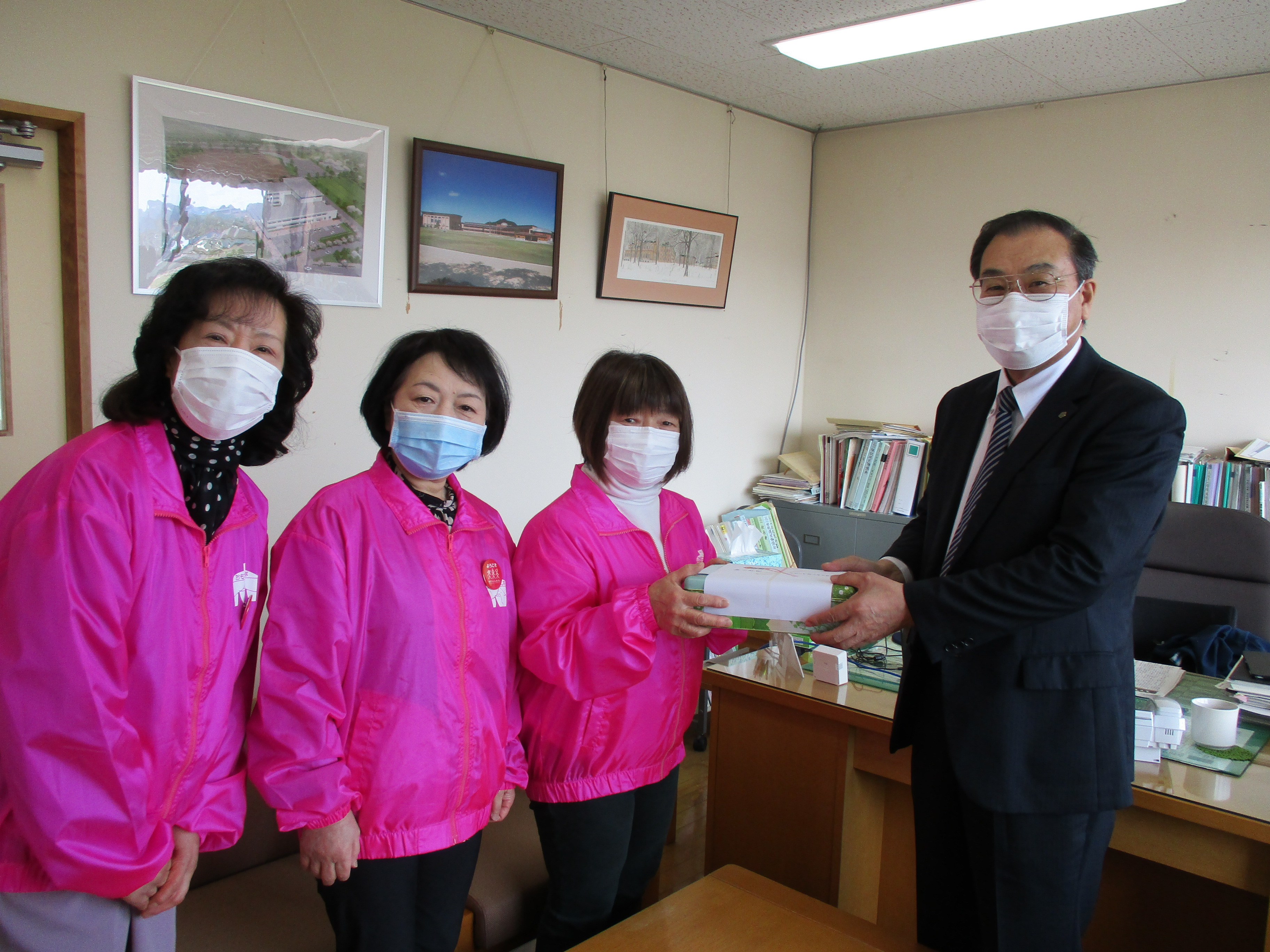 4月2日、3町の教育委員会を訪問し、五城目町へ42個、八郎潟町へ32個、井川町へ19個(いずれも予備分を含めた個数)を贈呈しました。