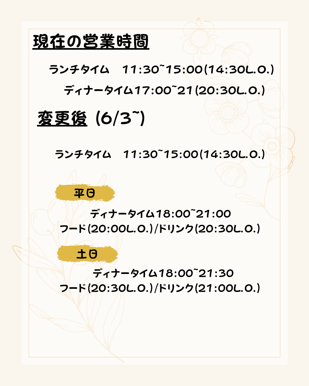 6月3日よりディナータイムの営業時間を上記の通り変更させていただきます