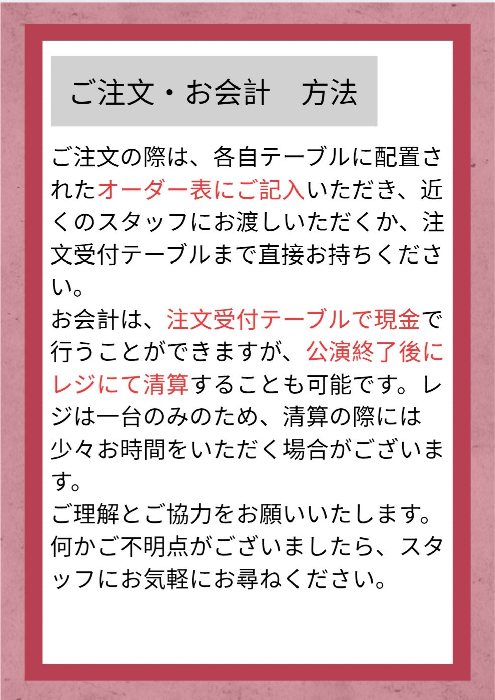 公演終了後の清算も可能ですが、レジが一台のみのため清算までにお時間をいただいております。ご注文ごとにお支払いも可能ですが、その際は現金のみでの清算をお願いしております。