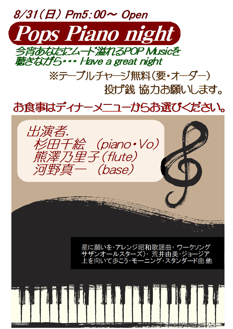 今週日曜日8月10日のランチタイムはディナーのライブ準備のため、下記の通り営業時間を変更させて頂きます。