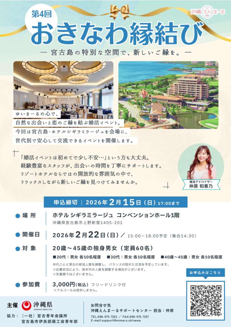 本事業は、少子化の要因の一つである未婚化・晩婚化に対する取組として、「おきなわ出会い応援企業」「おきなわ出会いサポート団体」や市町村等と連携し、結婚を希望する者に対して、出会いの場や交流の場を提供することを目的として実施します。トーク婚活においては、異性とアイスブレイク等を通して生まれる自然なコミュニケーションを共有することで、お互いの性格や印象をしっかりと感じることができる内容とし、併せて、「事前セミナー(動画)」や「婚活アドバイザーによるフォローアップ」など他のプログラムと有機的に連携したイベントです。本会青年部も広報や当日運営等で協力致します。