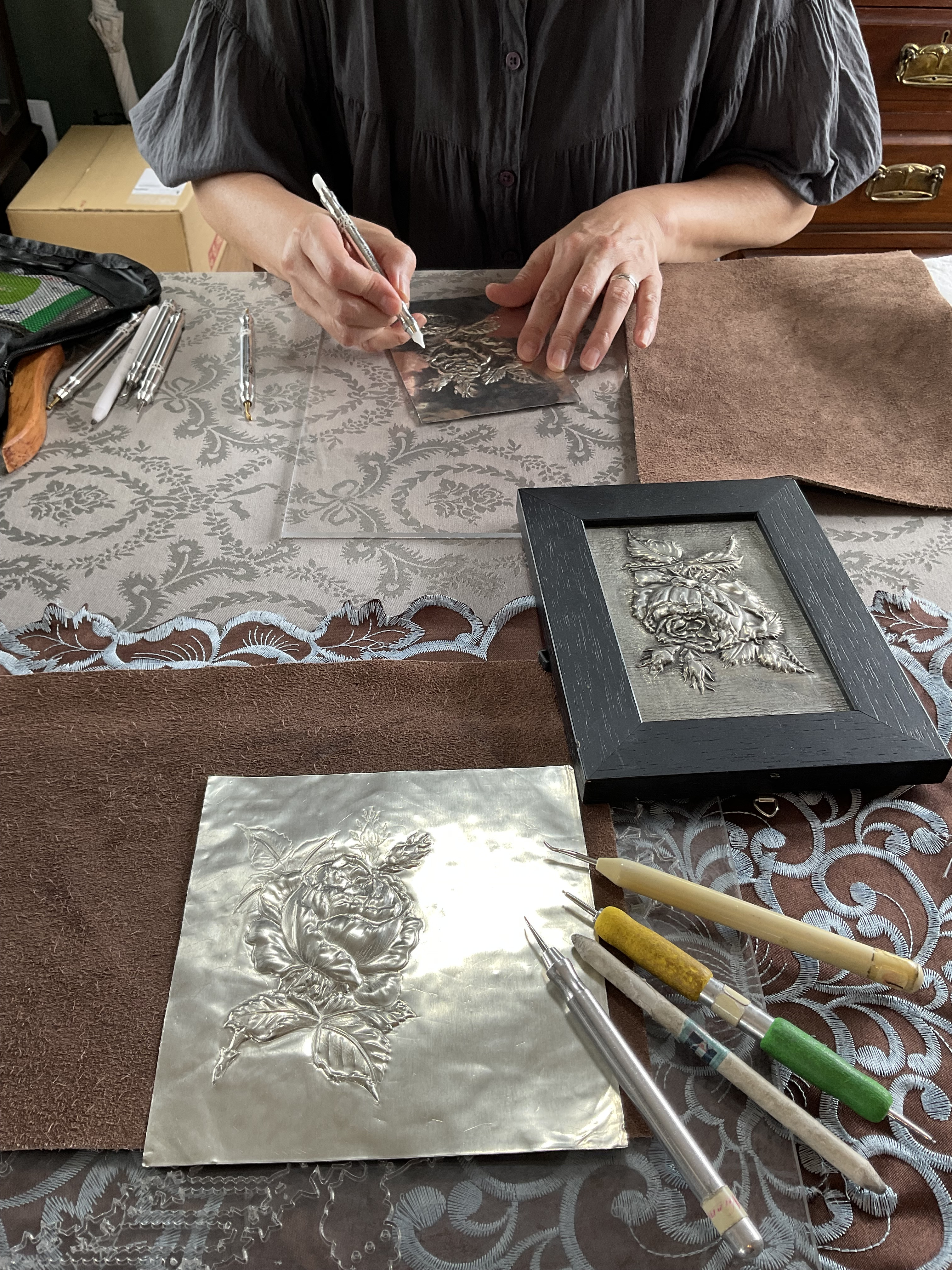 20年前からメタルエンボッシングアートに魅せられ、講師・師範資格を取得。