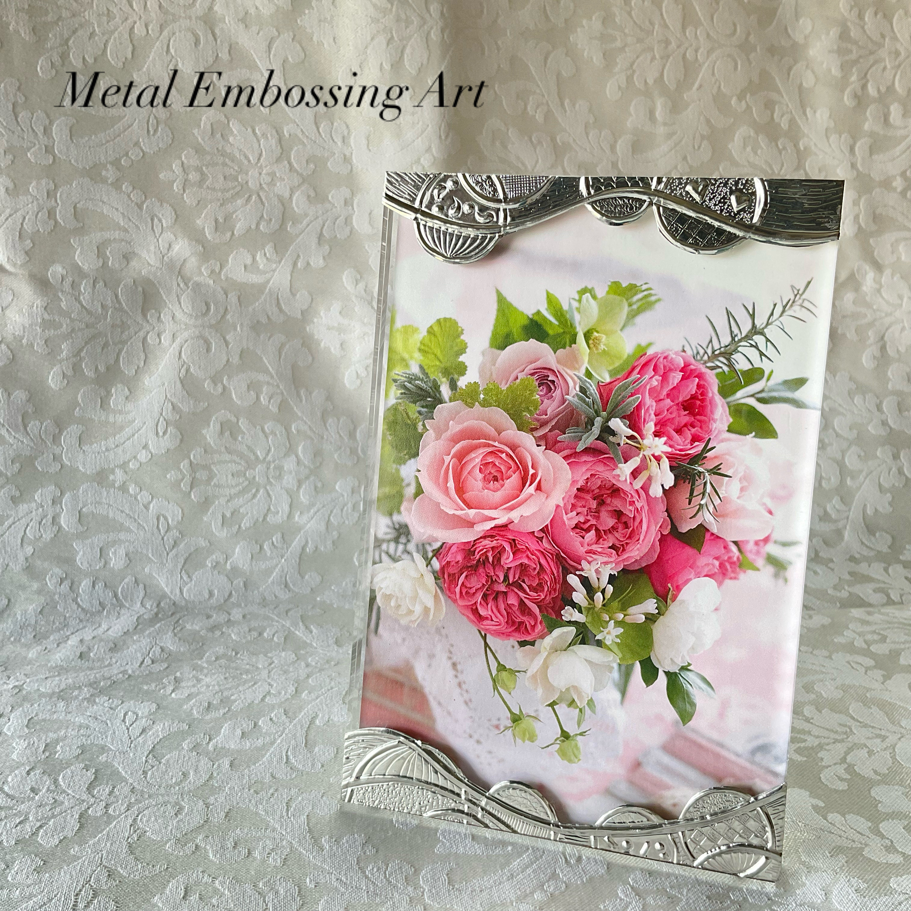 メタルエンボッシングアートのデザインもエレガントで挟める写真やハガキが映えること間違いなしです。