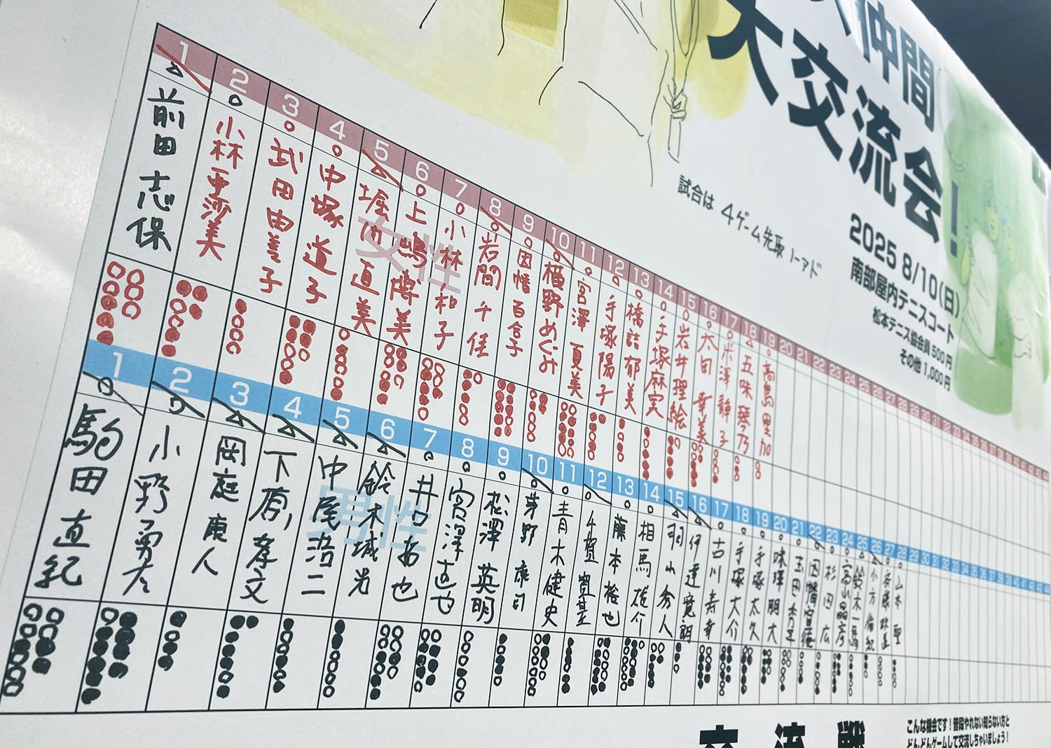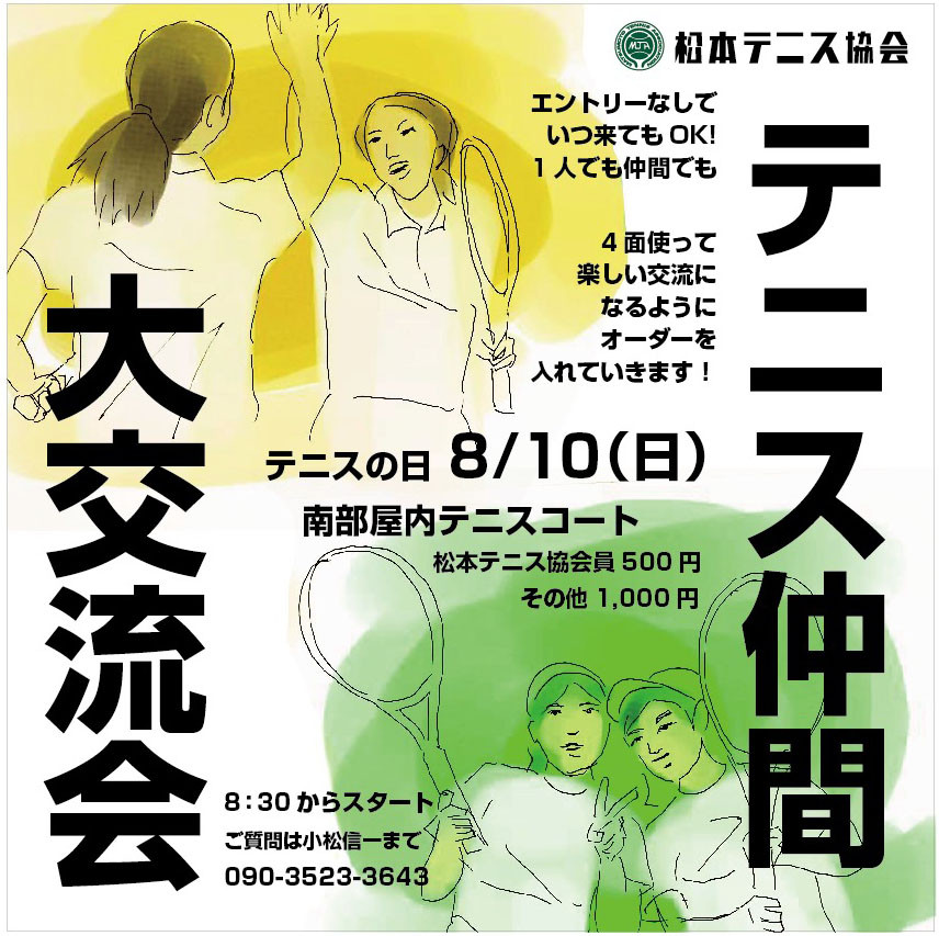 8:30のスタートからすでに大勢お集まりいただき、総勢47人の方が1日たっぷり試合をしました。多い人は10試合以上!初めて来ましたというお初の方や松本テニス協会に入っていない方、懐かしい方も噂を聞いて来てくれてありがとうございました。みんな1つは勝って大満足で帰られました。次回は3月、またお友達を誘ってご参加くださいね(^-^)小松信一。