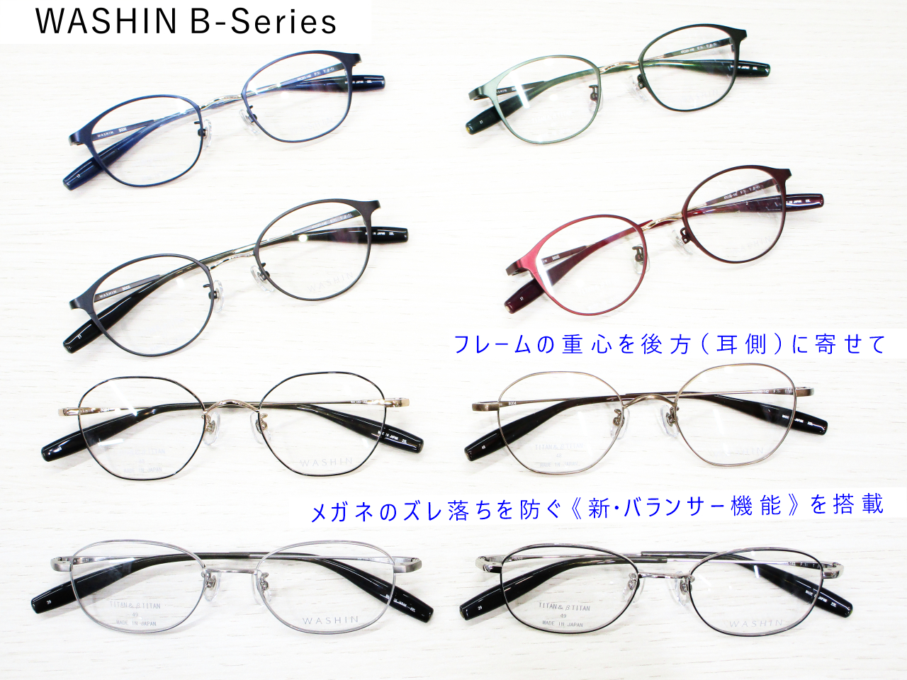 「WASHIN B-series」はモダン(耳掛け)の内部にメタルのウェイトを内蔵。フレームの重心を後方(耳側)に寄せてお鼻への負担を軽減し、バランスの良い掛け心地を実現しました。今までのメガネとの感覚の違いを、ぜひ店頭にてご体験ください。