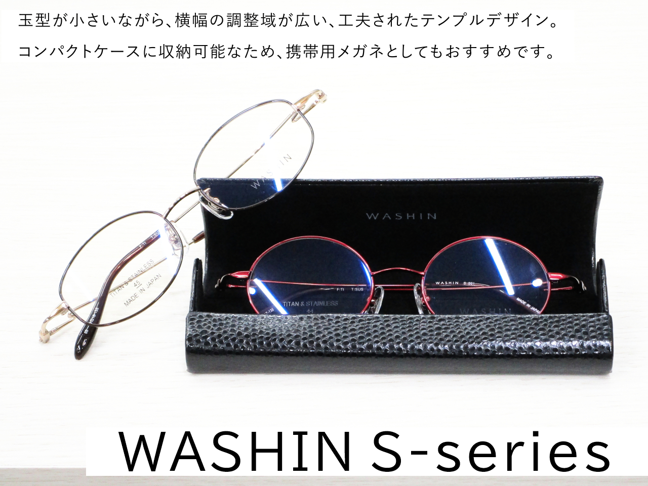「WASHIN S-series」は今まで似合うメガネが見つけにくかった、小顔の方、瞳の間隔が狭い方に向けたメガネです。工夫されたテンプルデザインが快適な掛け心地を提供してくれます。また、コンパクトケースに収納可能なため、携帯用メガネとしてもおすすめです。
