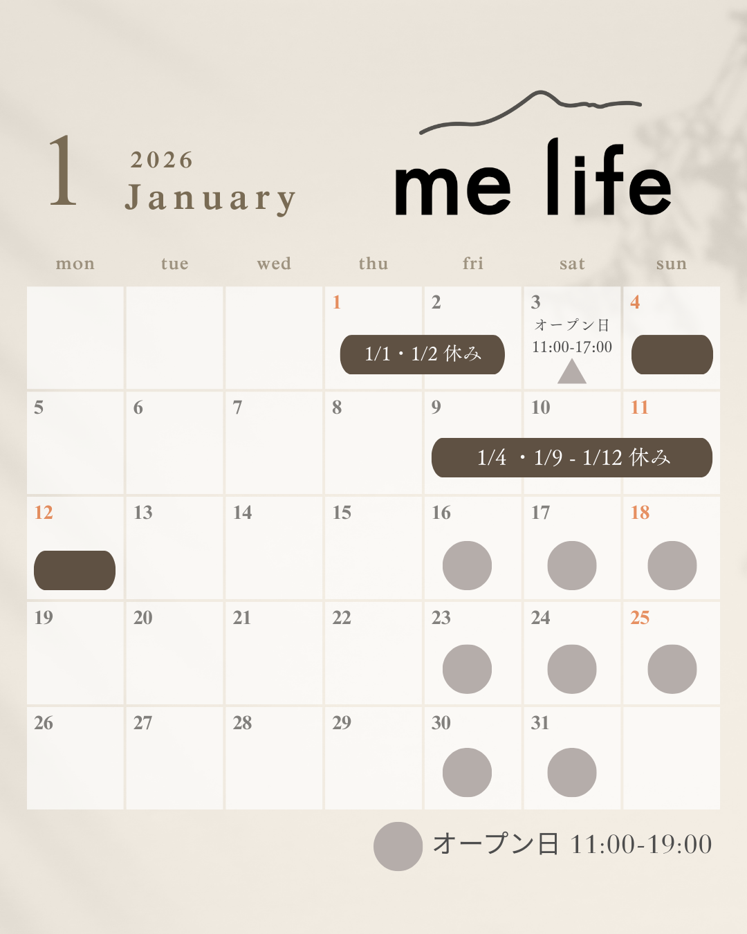 melife(ミーライフ) 2026年1月のオープン日のお知らせです。
