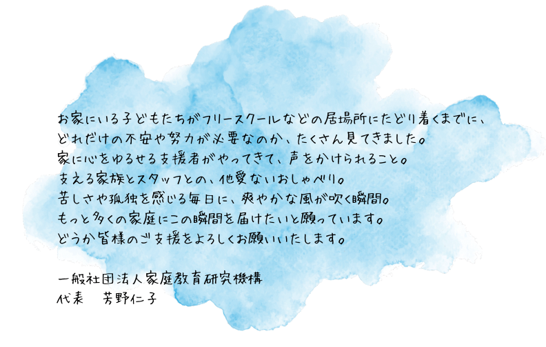 2022年12月1日〜2023年1月31日まで、一般社団法人家庭教育研究機構は「校内フリースクール送迎車購入資金」のためのクラウドファンディングに挑戦いたします。目標金額100万円を目指して皆さまよりご支援を募ります。