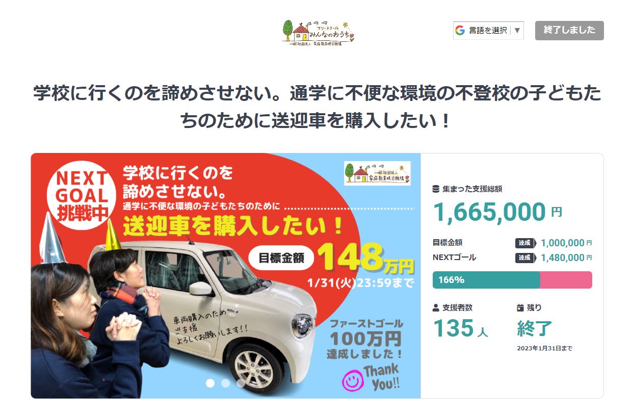 11月30日から始まった、送迎車「つなぐ号」購入のためのクラウドファンディングが、1月31日、終了いたしました。