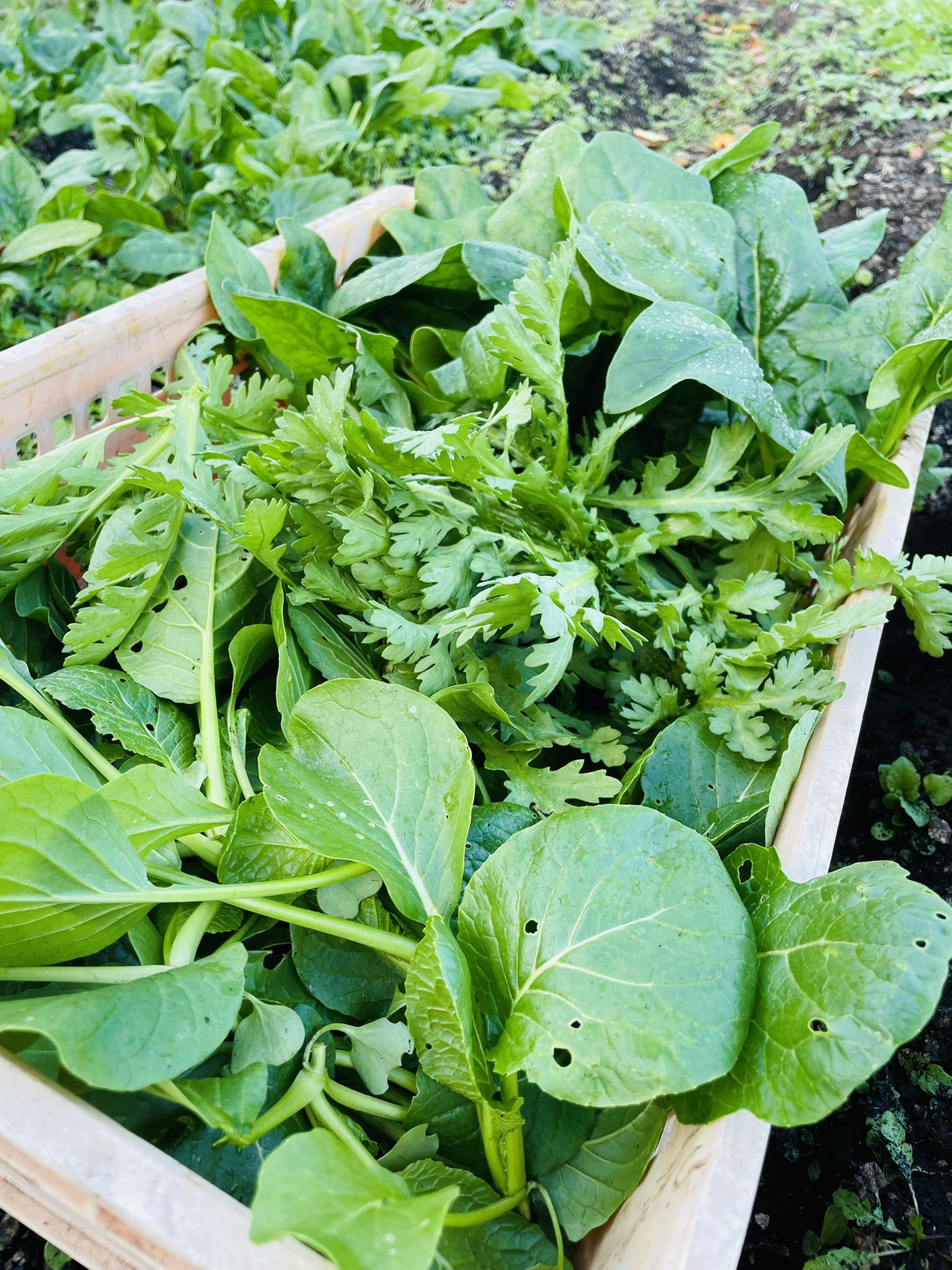 今日は自家農園で小松菜、春菊、ほうれん草を収穫しました。