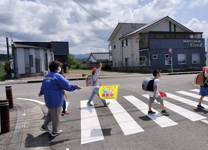 登下校時の子どもたちの安全を守るため、朝夕の時間帯に部員が通学路に立ち、横断旗を手に見守り活動を行っています。活動は各部員の都合に合わせて無理なく参加できるスタイルで行われており、地域ぐるみで子どもたちを見守る温かい環境づくりを進めています。