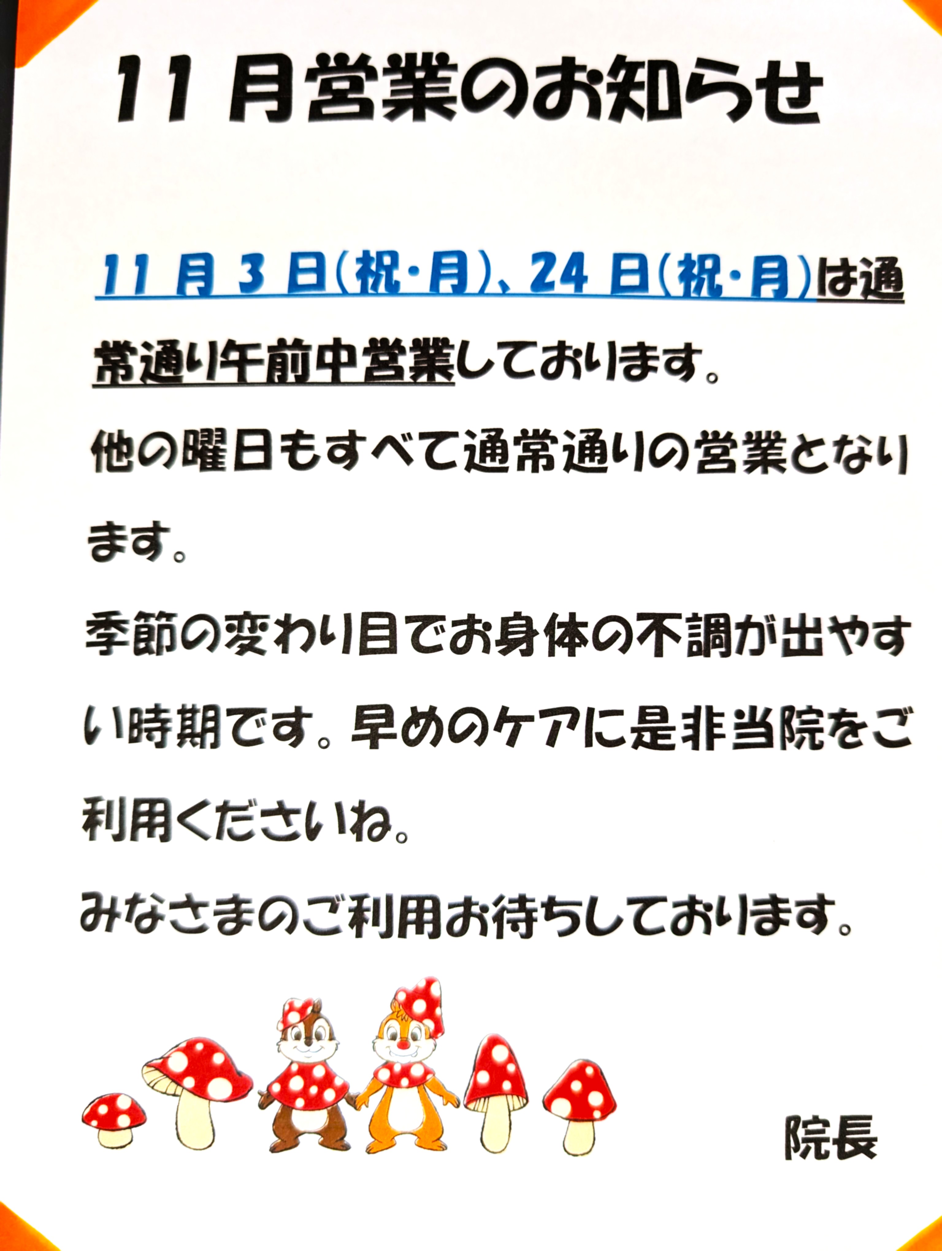 11月営業のお知らせです。