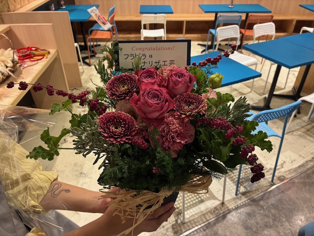 元気な店内、最高ですね!!お祝いのお花も、ストロベリーをイメージして、前橋の大好きなお花屋さんで作っていただきました。