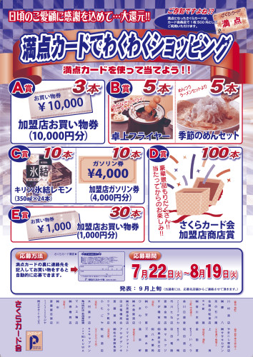 対象期間中(6/20-7/19)にさくらカード満点カードでお買いものをすると、抽選で豪華景品が当たります。さくらカード会商品券1万円分、飲食券、ガソリン券等...加盟店おす...