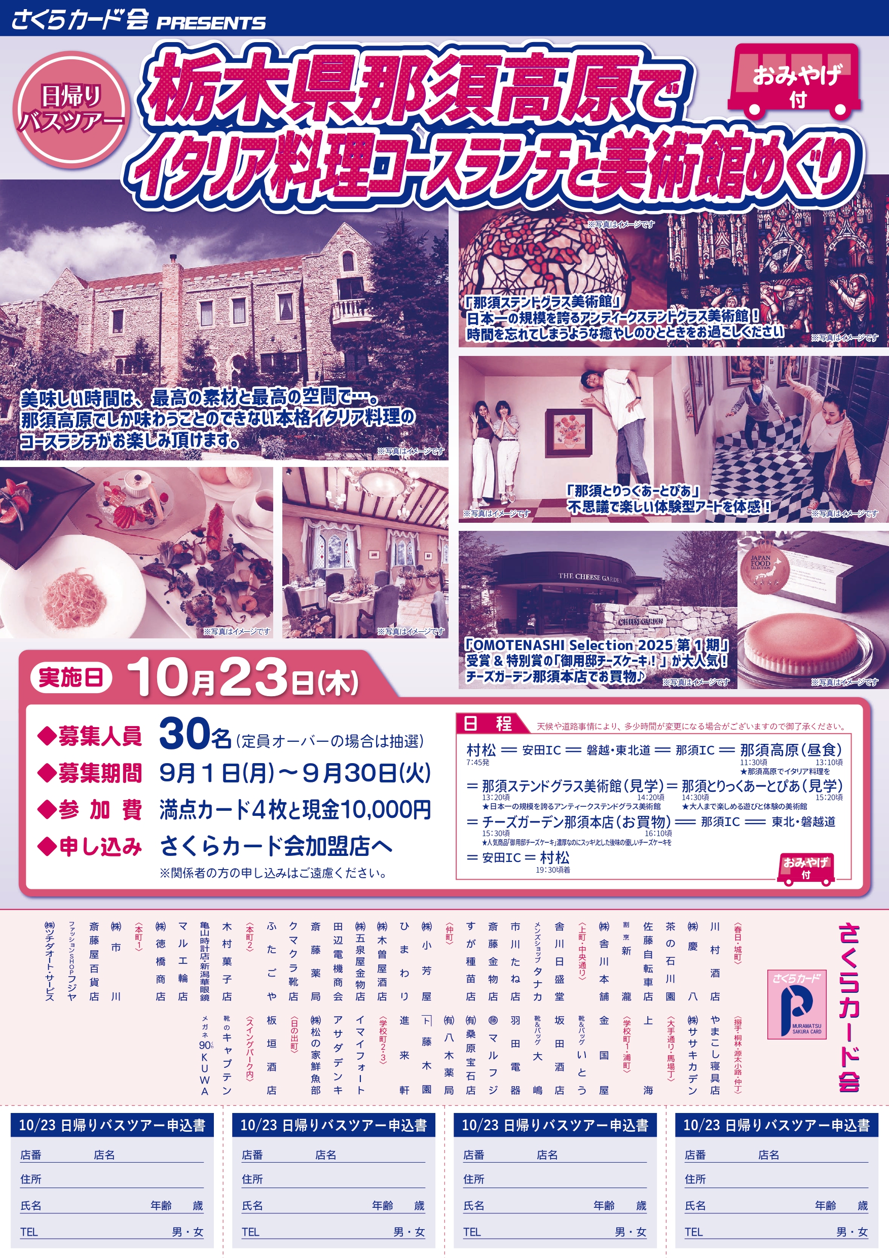 [村松さくらカード会] R7さくらカード会日帰りバスツアー☆栃木県那須高原でイタリア料理コースランチと美術館めぐり