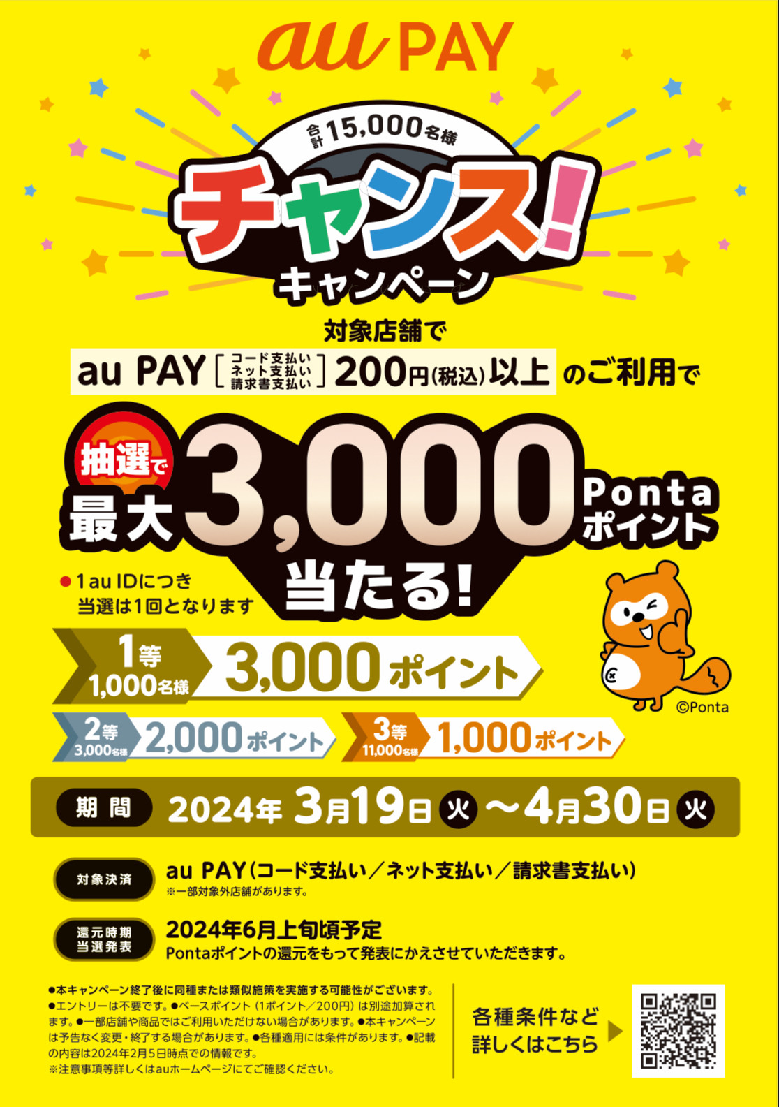 本日(3/19)〜4月30日までの期間中auPAYで200円以上決済すると抽選でPontaポイントを進呈致します。