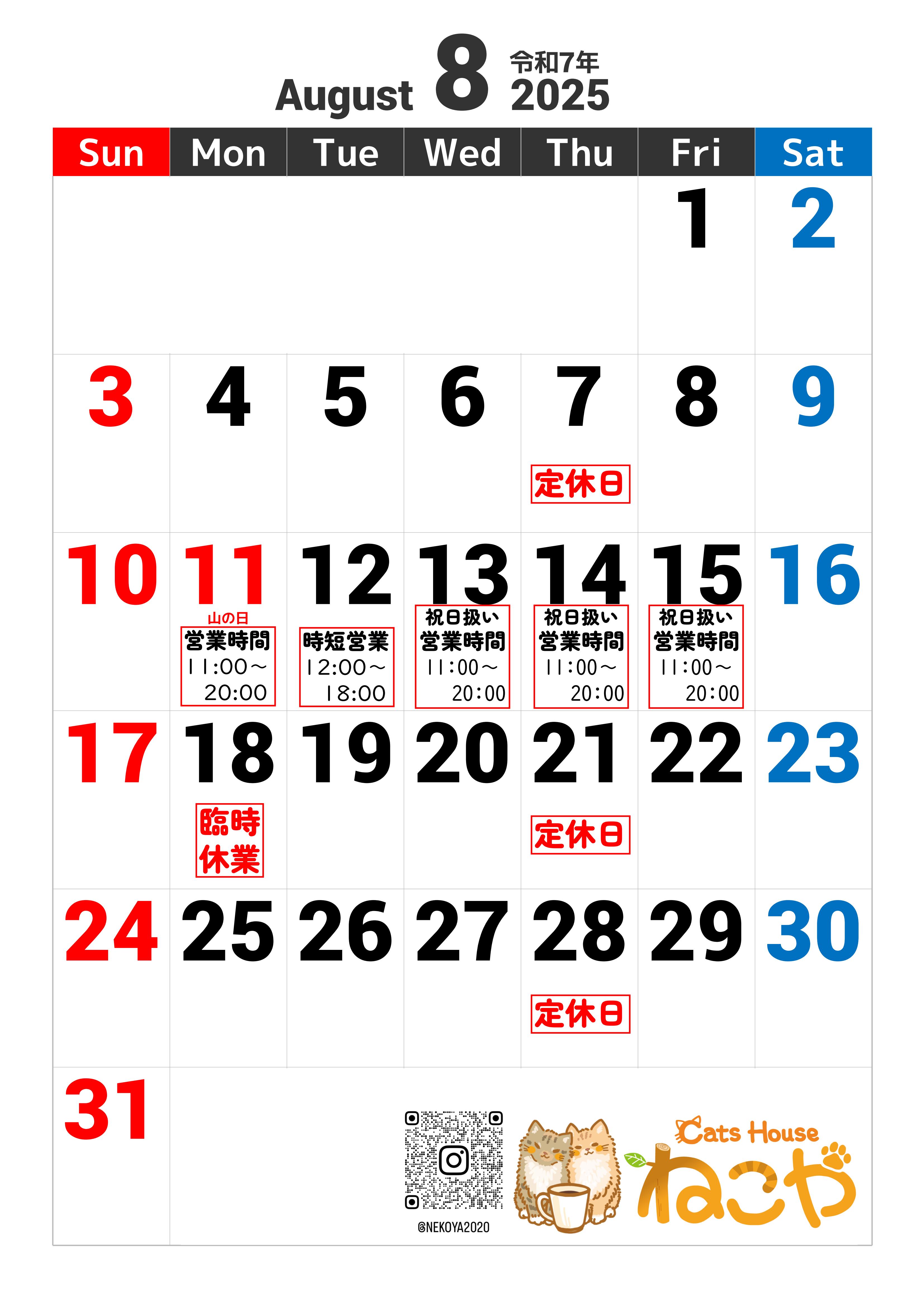 8月のねこやカレンダー