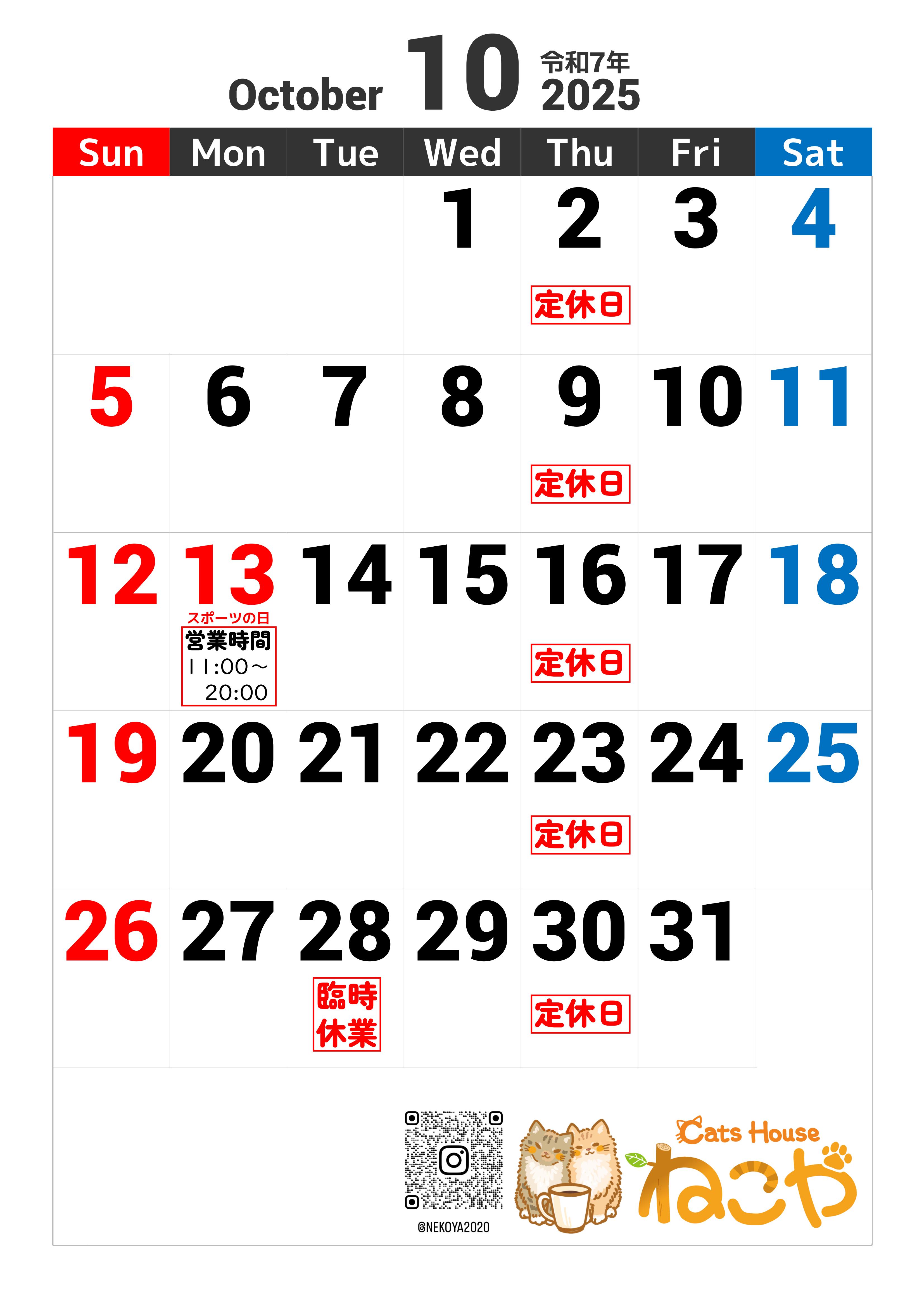 10月のねこやカレンダー