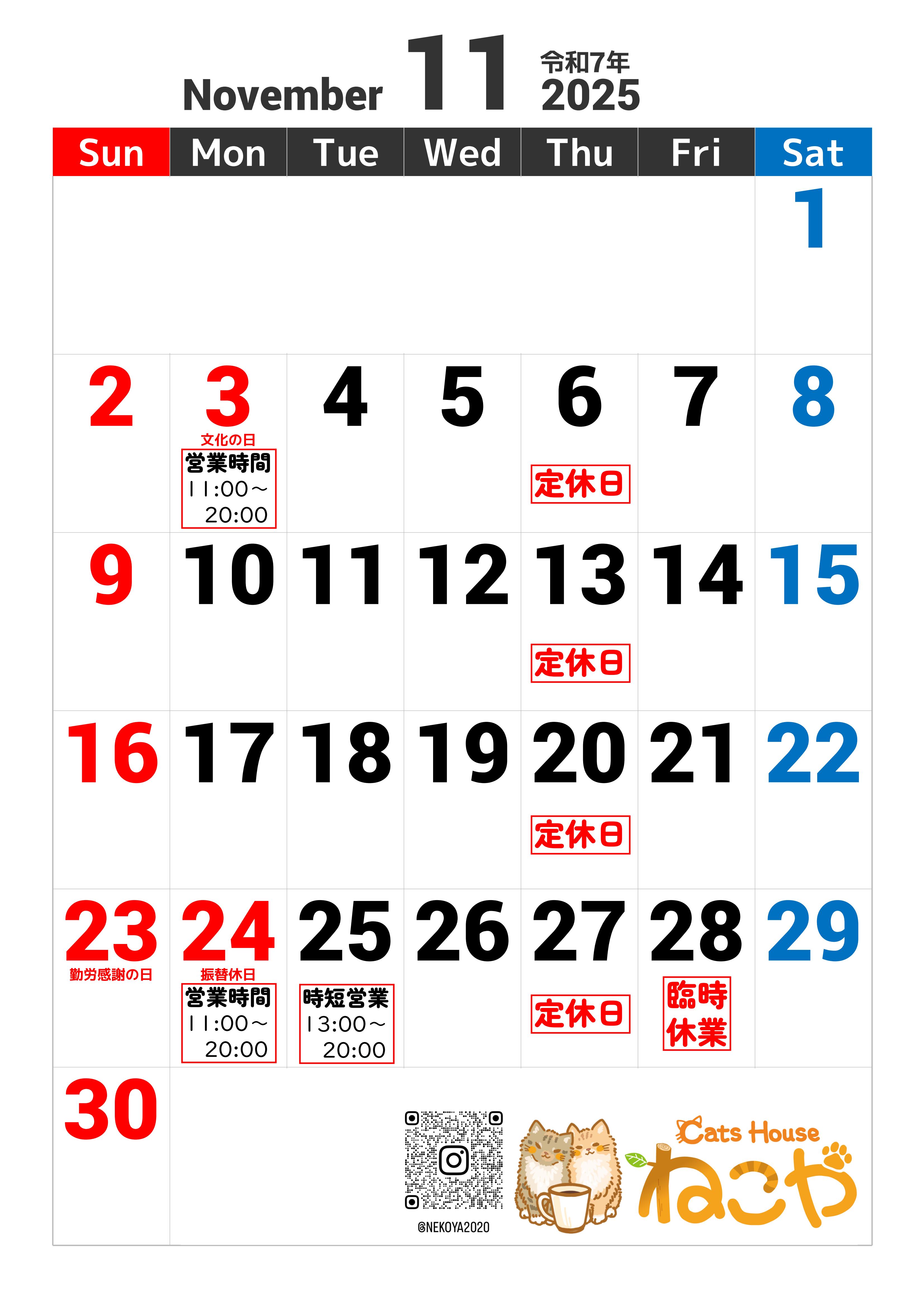 11月のねこやカレンダー