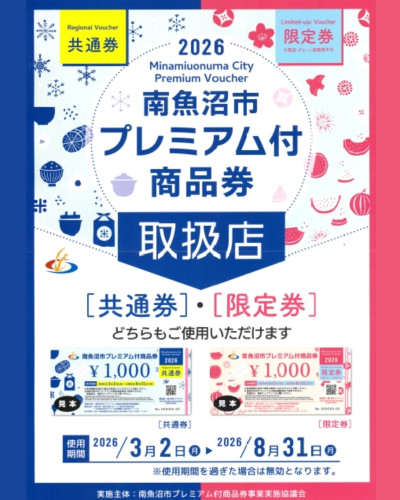 当社でも2026年3月2日販売開始の「南魚沼市プレミアム付商品券(共通券/限定券)」がご利用いただけます。販売期間:令和8年3月2日(月)~令和8年5月31日(日)使用期...