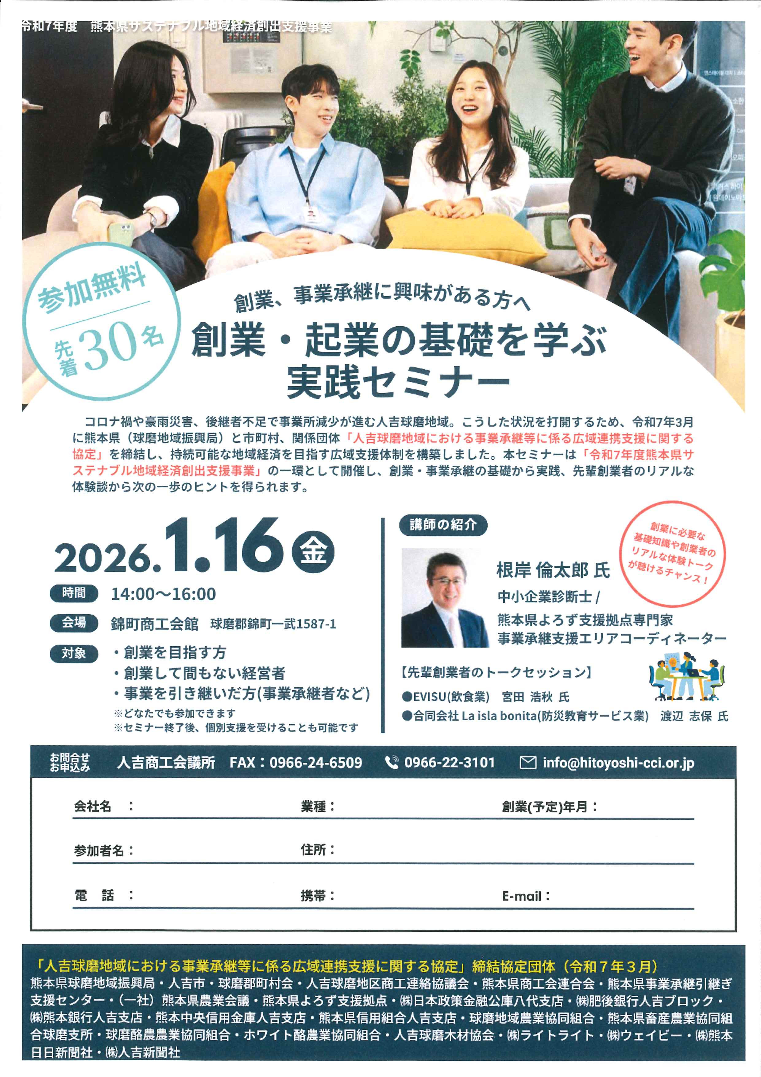 コロナ禍や豪⾬災害、後継者不⾜で事業所減少が進む人吉球磨地域。こうした状況を打開するため、令和7年3⽉に熊本県(球磨地域振興局)と市町村、関係団体「人吉球磨地域における事業承継等に係る広域連携支援に関する協定」を締結し、持続可能な地域経済を⽬指す広域支援体制を構築しました。セミナーは「令和7年度熊本県サステナブル地域経済創出支援事業」の⼀環として開催し、創業・事業承継の基礎から実践、先輩創業者のリアルな体験談から次の⼀歩のヒントを得られます。