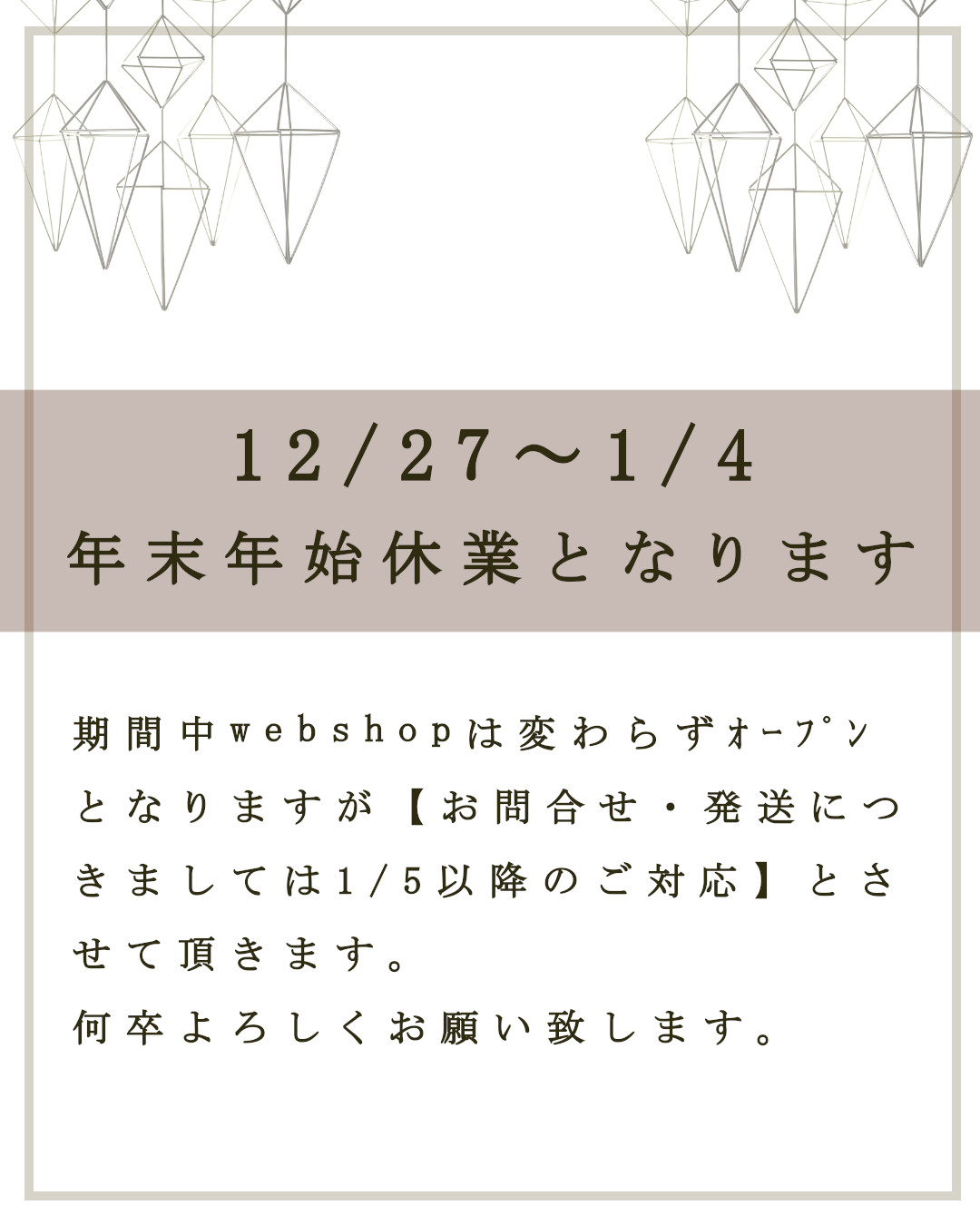 Webshopの方は期間中もオープンとなりますが、お問い合わせや発送業務などは1/5以降とさせて頂きます