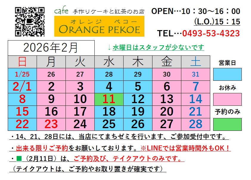 2026年2月の営業カレンダーを掲載しました。