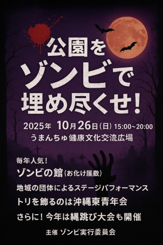 🎃🧟‍♀️✨第3回【公園をゾンビで埋め尽くせ】✨🧟‍♂️🎃今年もゾンビがやってくる👻💀今週10月26日(日)15:00〜20:00📍うまんちゅ健康文化交流広場(うるま市...