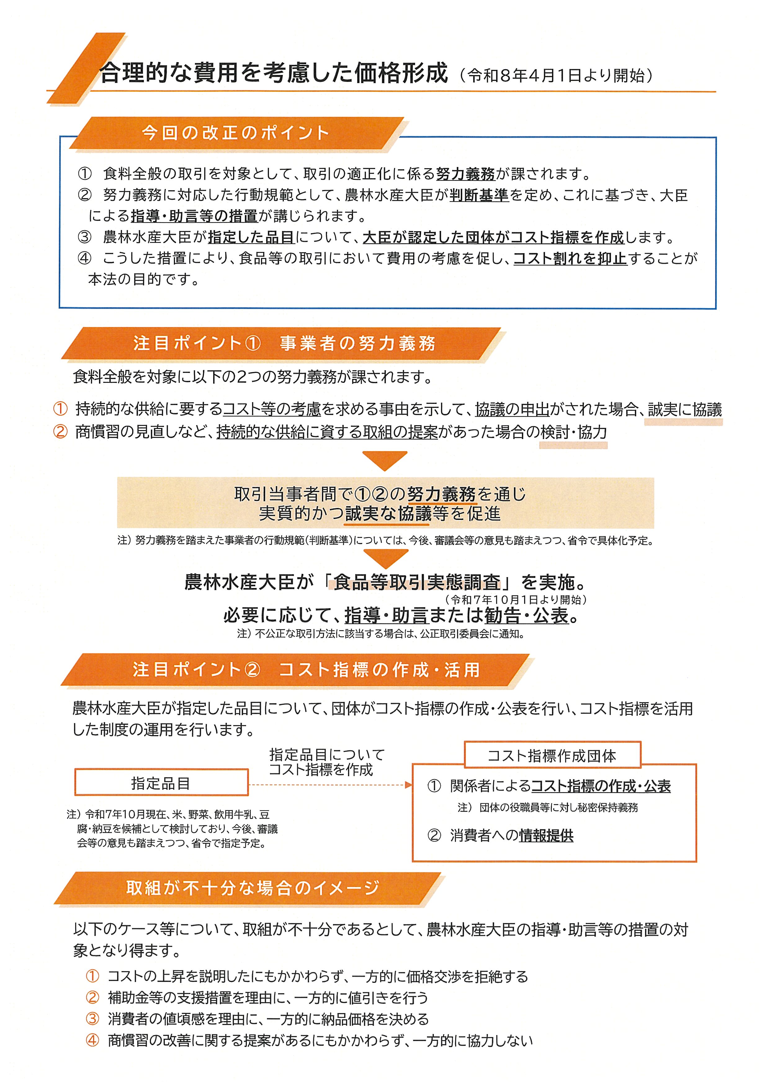 これにより、食料システム法が、令和8年4月1日に全面施行(予定」)されることに伴い、食品等の取引の適正化に関する基本的な方針や、飲食料品等事業者の具体的な行動規範となる判断基準、指定飲食料品等の指定について定めた省令が公布される見込みです。