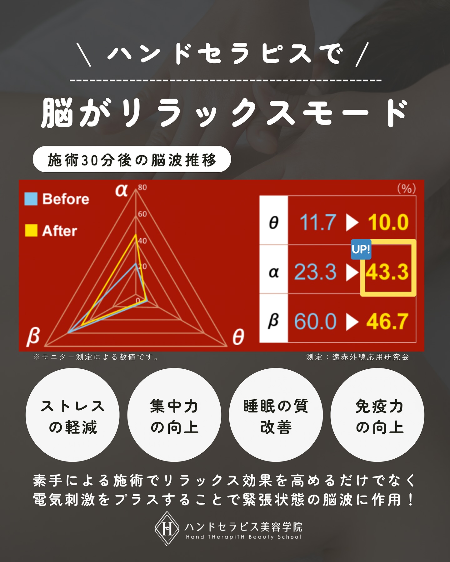 私たちが行っているハンドセラピスは素手による施術でリラックス効果を高めるだけはなく、電気刺激をプラスすることで緊張状態の脳波に働きかけます。
