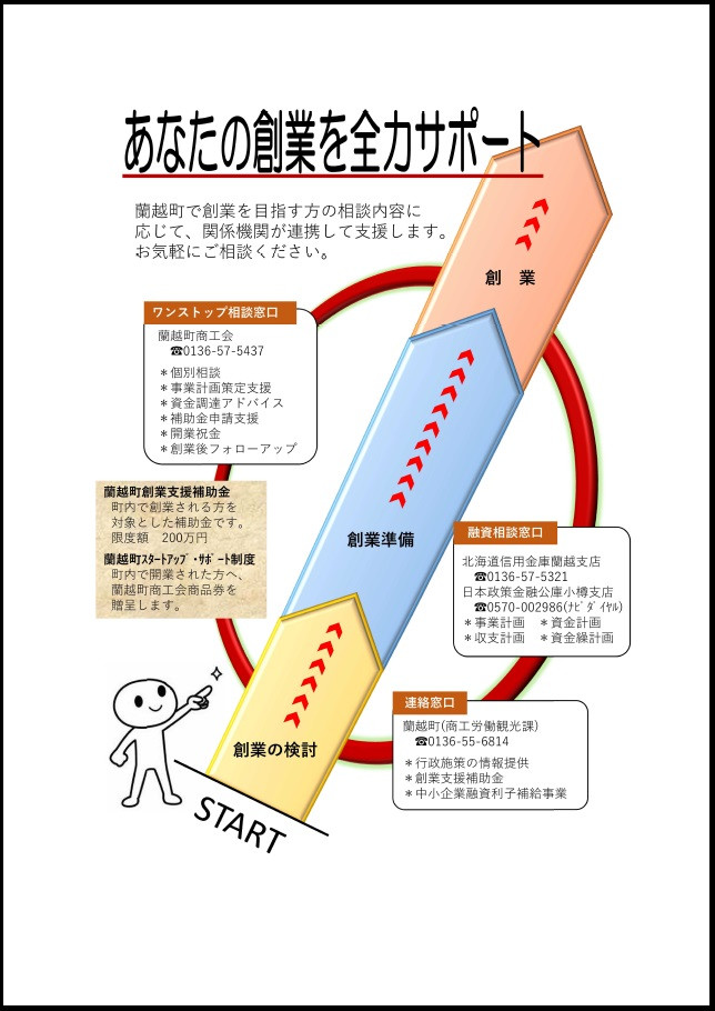 「何から始めたらいいのだろう」「創業したいけど知識がない」「資金繰りはどうしたらいいのか」といった疑問や悩みなどを創業者一人ひとりの相談内容や創業準備段階に応じて、蘭越町商工会・北海道信用金庫蘭越支店などの金融機関・蘭越町が連携して創業のお手伝いをします。