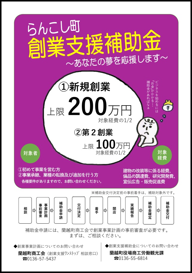 住所要件や対象外事業など各種要件がありますので詳細は蘭越町商工会(0136-57-5437)または蘭越町役場商工労働観光課(0136-55-6814)までお問い合わせください。