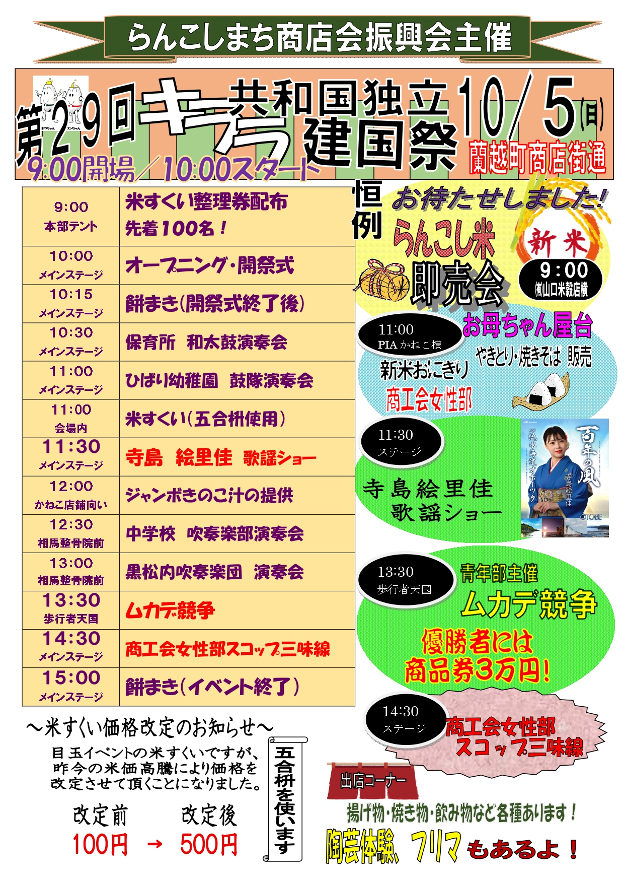 様々な催しと出店、毎年恒例米すくいにジャンボきのこ汁、餅まき、ムカデ競争などなどたくさんありますので是非ご来場ください!