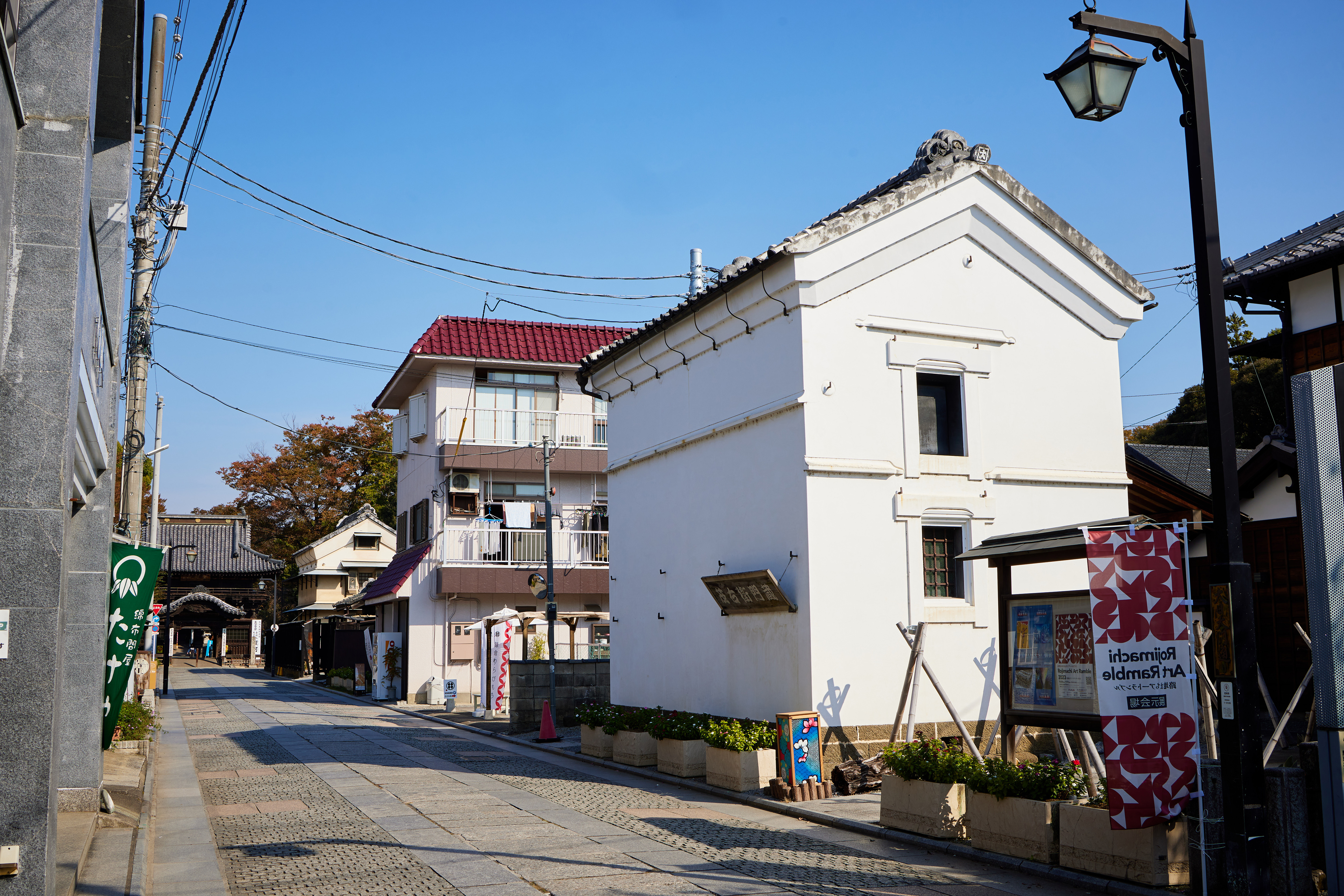 鑁阿寺は太鼓橋に続く門前石畳通りの途中。安政5年に建てられ、機織り業の倉庫だった白漆喰の蔵です。現在はイベントスペースとして公開されています。トイレ駐車場なし。近くに公共駐車場あり。